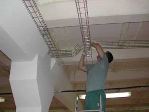 На данном этапе осуществляется черновая работа, т.е. готовятся и крепятся опорные конструкции для кабелей, при необходимости делаются штробы, создается заземление. Так же необходимо учитывать и рост производства и следовательно увеличение напряжения, поэтому все конструкции производятся с расчетом на более мощные производственные мощности. Так же важно отметить, что при электромонтаже производственных помещений множество электротехнических работ необходимо делать на достаточно большой высоте, по этой причине существует вероятность применения дополнительной спецтехники или дополнительного оборудования.